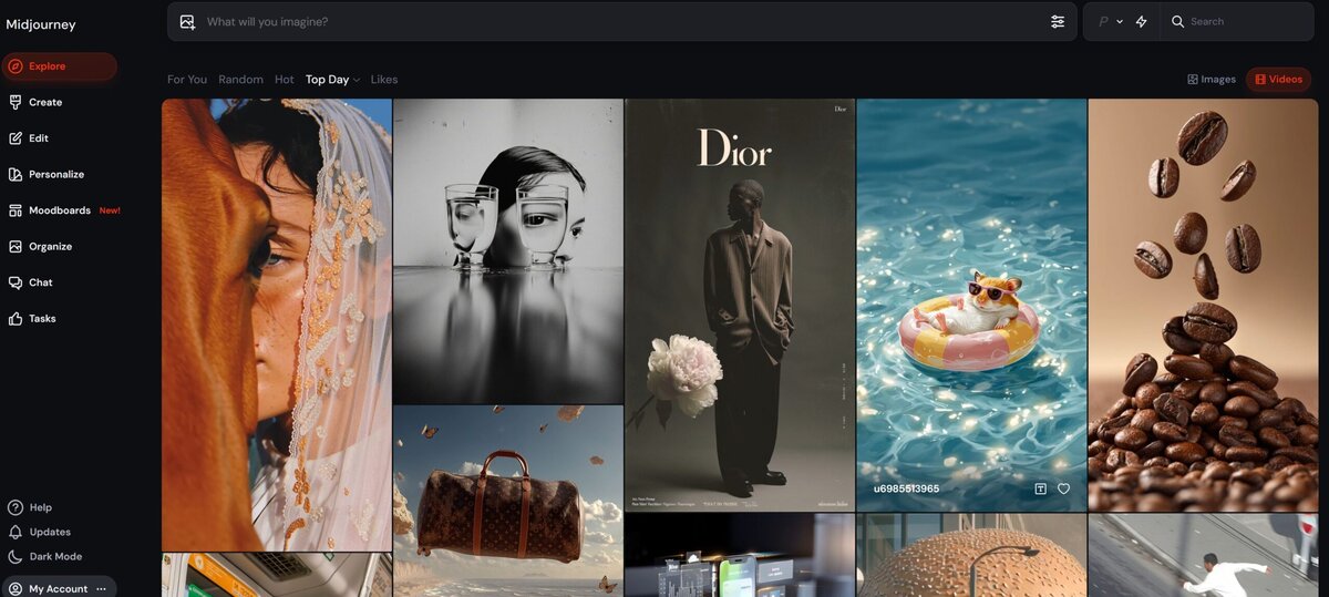 In der Übersicht findet ihr ein Auswahl von Bilder / Video von anderen User unter dem Hashtag „Top Day“. Klickt ihr auf eines der Bilder bekommt ihr mehr Details angezeigt. U.A. findet ihr den Prompt, der für die jeweilige Erstellung benutzt wurde. Am Beispiel des Dior Bildes wurde folgender Prompt genutzt.